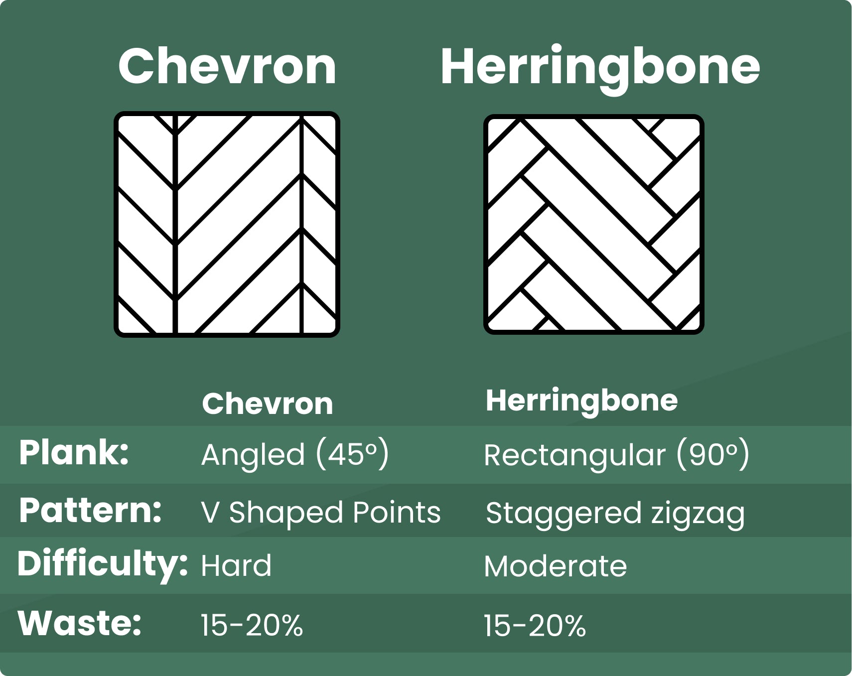 Waste: According to ATFA guidelines and installer feedback we've collected, chevron typically results in 12-15% waste compared to 10-12% for herringbone. Those angled end cuts mean more offcuts that can't be reused.